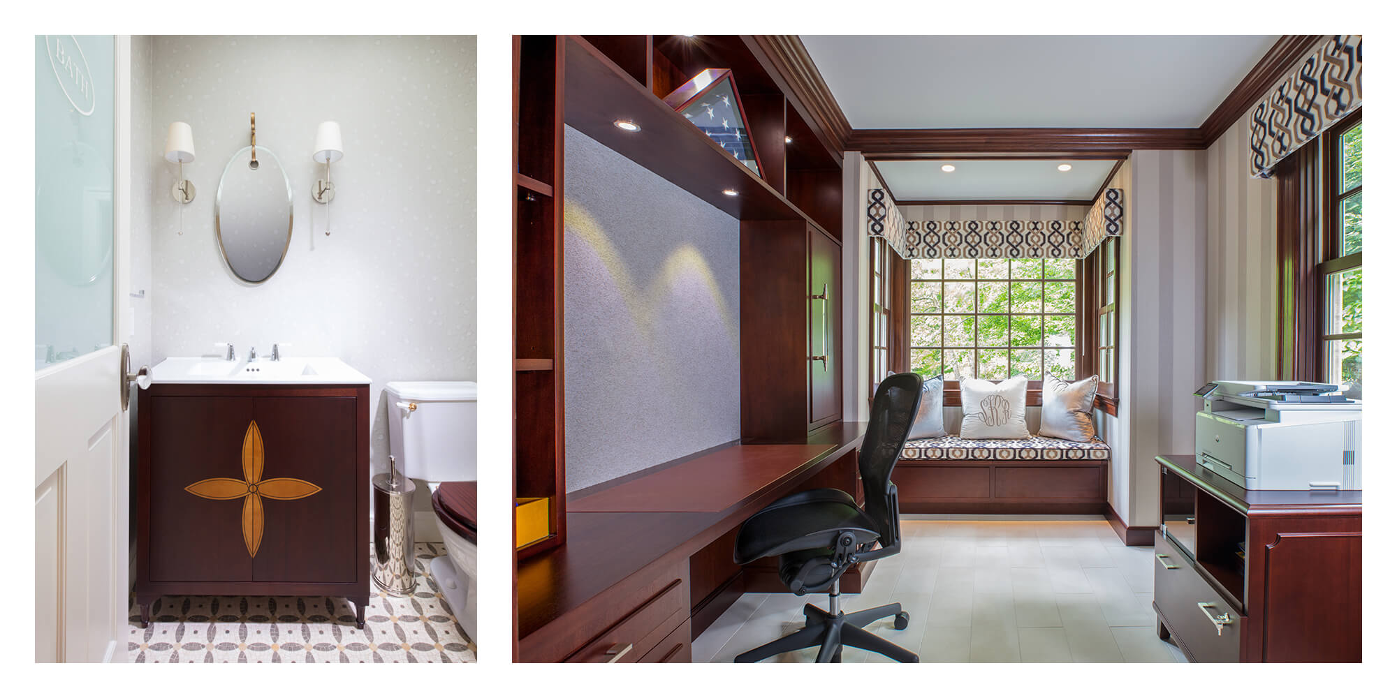 This project involved transforming a mudroom into an office, adding new furniture to the existing living room, and designing a custom vanity for the guest bathroom. The challenge was maintaining a balance between the existing structure and incorporating new pieces. The results were a glamorous office featuring a custom-designed desk, printer stand, and bench, enhanced with top-of-the-line fabrics and proper lighting. The living room benefited from a new sofa, side chair, coffee table, side table, and two ottomans making the room more modern and sophisticated. The guest bathroom underwent a complete change with the addition of a small custom vanity. Custom furniture was created in partnership with Atrium Interiors.